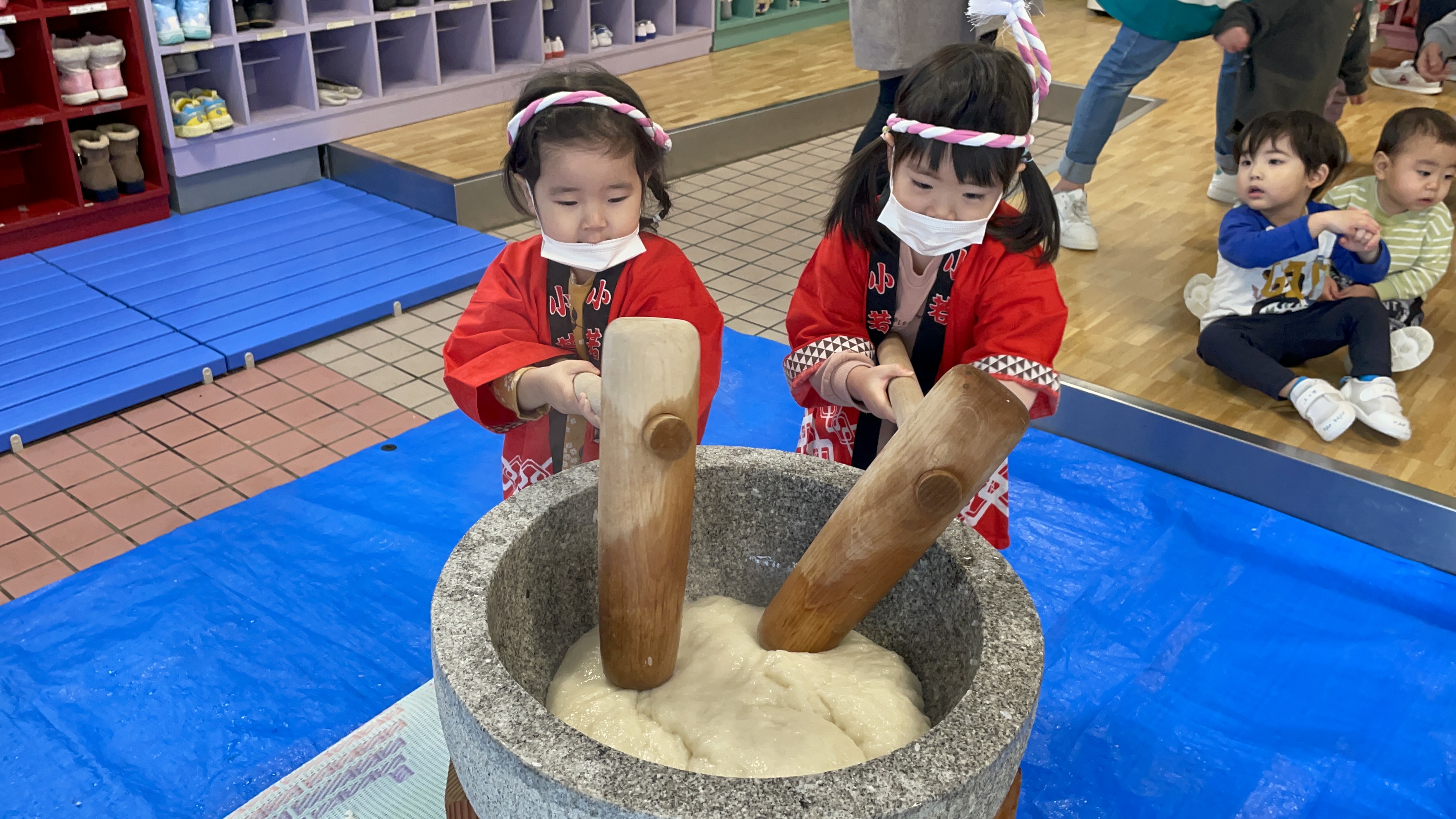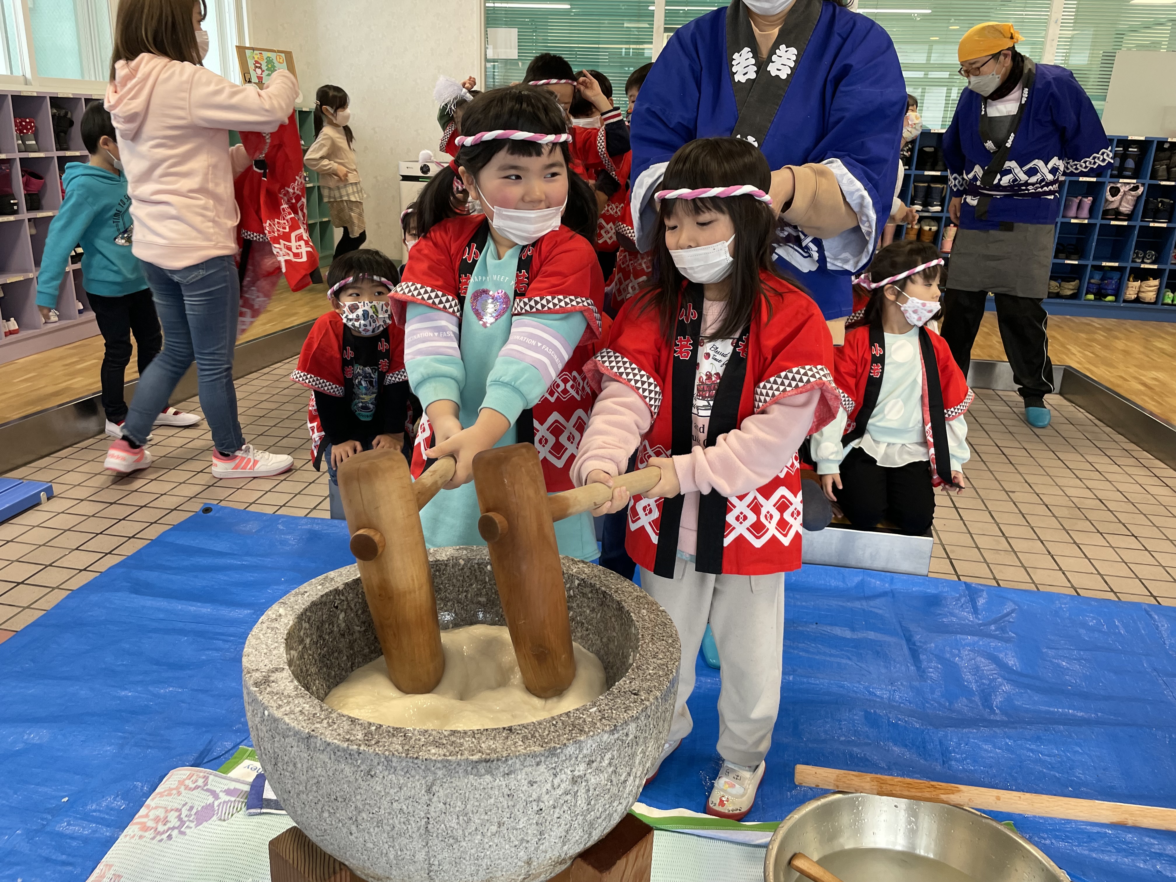 12月22日 幼稚園でおもちつきをしました!! 朝からもち米を蒸かすいい匂いが幼稚園の中に広がり、みんなお餅つきをワクワクして待っていました!! 重たい杵を頑張ってもって ぺったんぺったん お餅つき👍😊 あんこやきなこ、砂糖醤油をつけてみんなで美味しくいただきました💕
